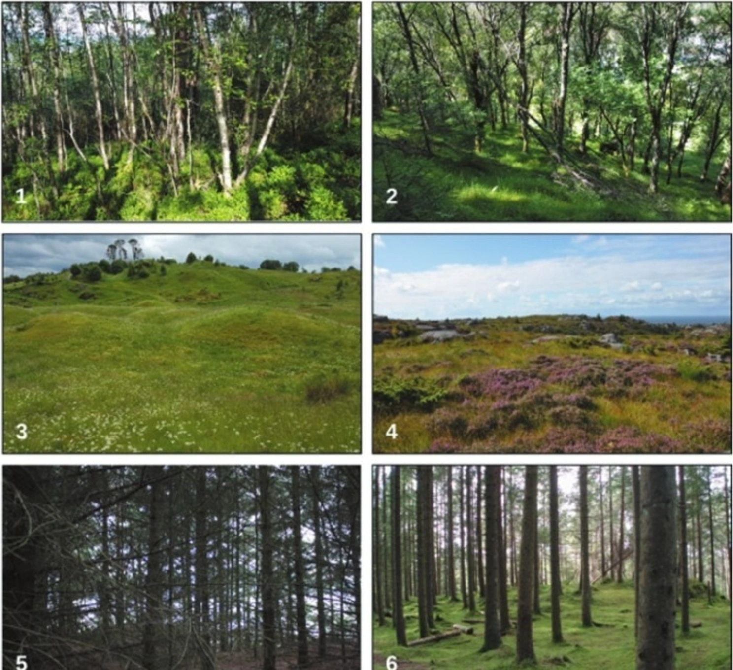Photos used in the study to illustrate landscape types. Which do you prefer? 1) Young mixed forest. 2) Old mixed forest. 3) Grassland. 4) Heathland. 5) Young planted spruce forest. 6) Old planted spruce frorest. Credit: The Norwegian Citizen Panel