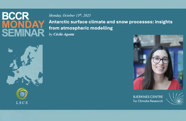 The next BCCR Monday Seminar will be given by Cécile Agosta from Laboratoire des Sciences du Climat et de l’Environnement. She will present her work on "Antarctic surface climate and snow processes: insights from atmospheric modeling". The seminar will take place in the usual BCCR seminar room (4th floor of the West wing) at 14:30.