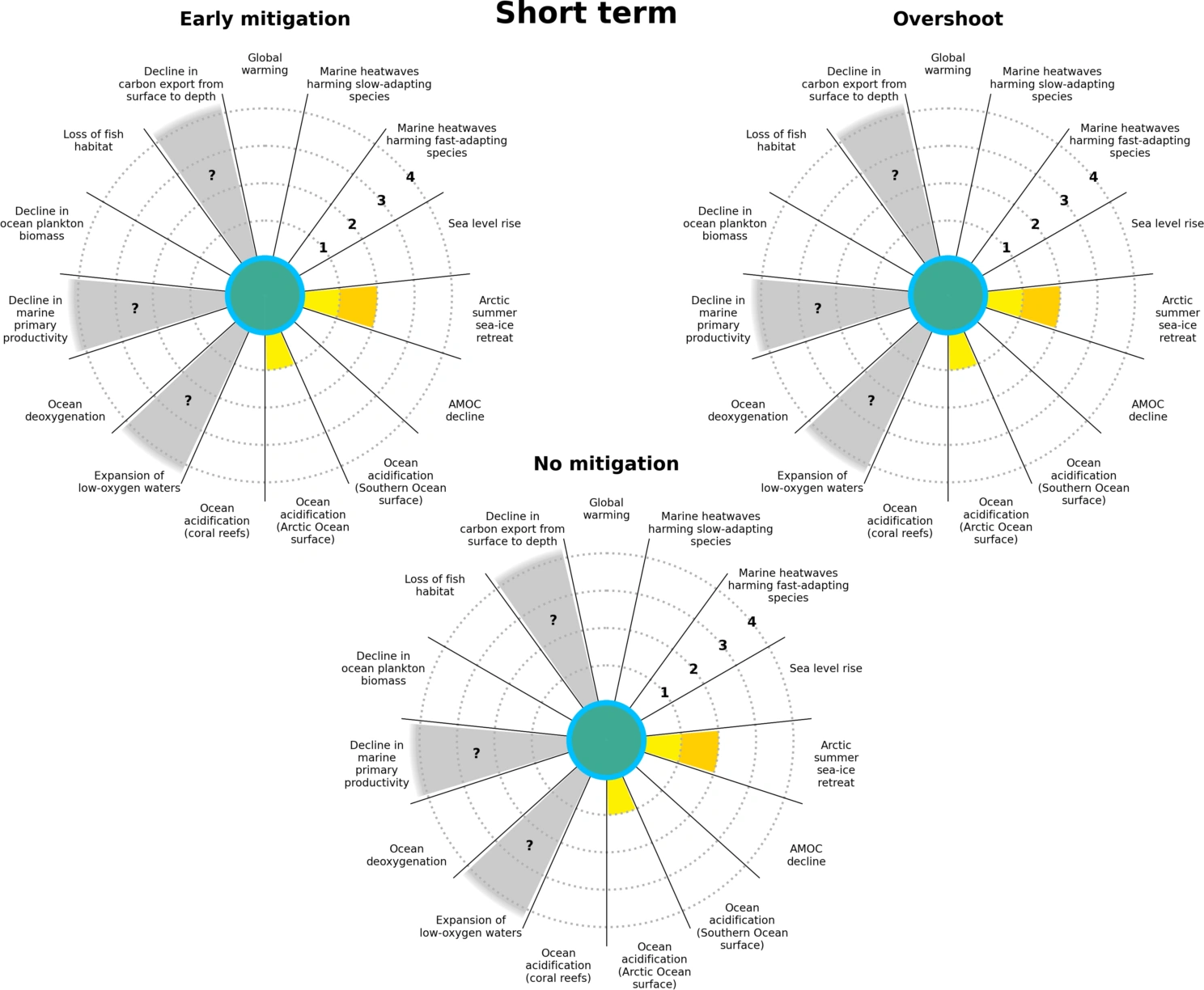 To estimate timing and warming levels at which ocean indicators exceed four limits of different severity, the researchers explored simulations of three future emission scenarios: Two scenarios with climate mitigation strategies, and one high-emissions scenario with no climate mitigation.