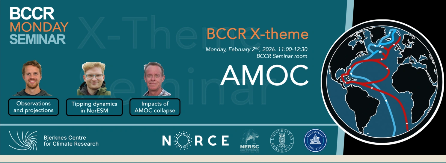 Hence, we are delighted to announce our monthly BCCR X-Theme seminar next week on Monday, February 2nd, at 11:00, with the title “AMOC”, presented by Marius Årthun, Malte Jürchott and Martin Miles.